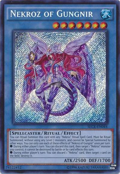 You can Ritual Summon this card with any ‘Nekroz’ Ritual Spell Card. Must be Ritual Summoned, without using any Level 7 monsters, and cannot be Special Summoned by other ways. You can only use each of these effects of ‘Nekroz of Gungnir’ once per turn.● During either player’s turn: You can discard this card, then target 1 ‘Nekroz’ monster you control; it cannot be destroyed by battle or by card effects this turn.● During either player’s turn: You can discard 1 ‘Nekroz’ card, then target 1 card on the field; destroy it.