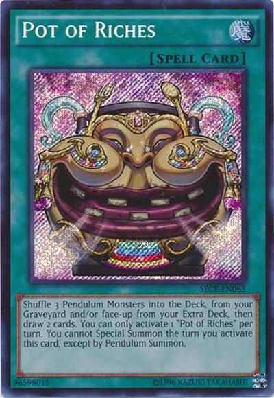 Shuffle 3 Pendulum Monsters into the Deck, from your GY and/or face-up from your Extra Deck, then draw 2 cards. You can only activate 1 ‘Pot of Riches’ per turn. You cannot Special Summon the turn you activate this card, except by Pendulum Summon.