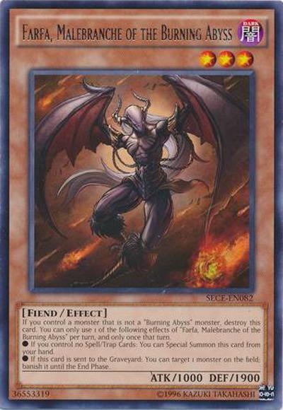 If you control a monster that is not a ‘Burning Abyss’ monster, destroy this card. You can only use 1 of these effects of ‘Farfa, Malebranche of the Burning Abyss’ per turn, and only once that turn.● If you control no Spell/Trap Cards: You can Special Summon this card from your hand.● If this card is sent to the Graveyard: You can target 1 monster on the field; banish it until the End Phase.