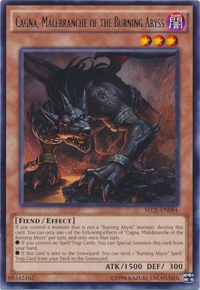 If you control a monster that is not a ‘Burning Abyss’ monster, destroy this card. You can only use 1 of these effects of ‘Cagna, Malebranche of the Burning Abyss’ per turn, and only once that turn.● If you control no Spell/Trap Cards: You can Special Summon this card from your hand.● If this card is sent to the Graveyard: You can send 1 ‘Burning Abyss’ Spell/Trap Card from your Deck to the Graveyard.