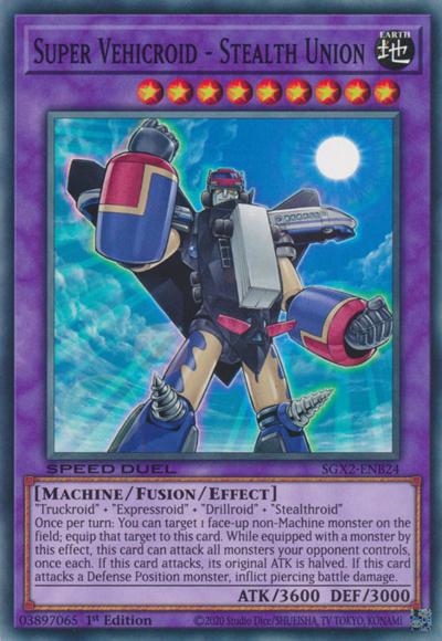 ‘Truckroid’ + ‘Expressroid’ + ‘Drillroid’ + ‘Stealthroid’When this card attacks, its original ATK is halved until the end of the Damage Step. During battle between this attacking card and a Defense Position monster whose DEF is lower than the ATK of this card, inflict the difference as Battle Damage to your opponent. Once per turn, during your Main Phase, you can select 1 face-up monster on the field, except a Machine-Type monster, and equip it to this card. While equipped by this effect, this card can attack all monsters your opponent controls once each.