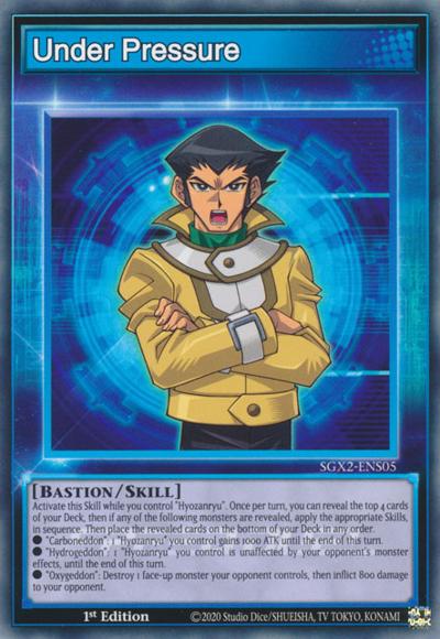 Skill activationAt the start of the Duel, flip this card over.EffectActivate this Skill while you control ‘Hyozanryu’. Once per turn, you can reveal the top 4 cards of your Deck, then if any of the following monsters are revealed, apply the appropriate Skills, in sequence. Then place the revealed cards on the bottom of your Deck in any order.● ‘Carboneddon’: 1 ‘Hyozanryu’ you control gains 1000 ATK until the end of this turn.● ‘Hydrogeddon’: 1 ‘Hyozanryu’ you control is unaffected by your opponent’s monster effects, until the end of this turn.● ‘Oxygeddon’: Destroy 1 face-up monster your opponent controls, then inflict 800 damage to your opponent.