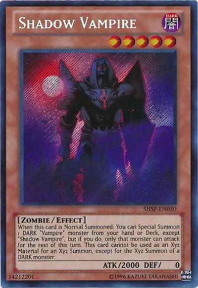 Cannot be used as material for an Xyz Summon, except for the Xyz Summon of a DARK monster. When this card is Normal Summoned: You can Special Summon 1 DARK ‘Vampire’ monster from your hand or Deck, except ‘Shadow Vampire’, but monsters you control cannot attack for the rest of this turn, except that Special Summoned monster.