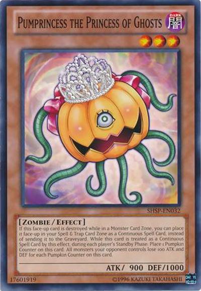 If this face-up card is destroyed while in a Monster Zone, you can place it face-up in your Spell & Trap Zone as a Continuous Spell Card, instead of sending it to the Graveyard. While this card is treated as a Continuous Spell Card by this effect, during each player’s Standby Phase: Place 1 Pumpkin Counter on this card. All monsters your opponent controls lose 100 ATK and DEF for each Pumpkin Counter on this card.