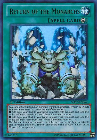 You cannot Special Summon monsters from the Extra Deck. When you Tribute Summon a monster: You can activate 1 of these effects;● Add, from your Deck to your hand, 1 monster with 2400 ATK and 1000 DEF with a different name from that Tribute Summoned monster.● Add, from your Deck to your hand, 1 monster with 2800 ATK and 1000 DEF with a different name from that Tribute Summoned monster.The Tribute Summoned monster must be face-up on the field to activate and to resolve this effect. You can only use this effect of ‘Return of the Monarchs’ once per turn.
