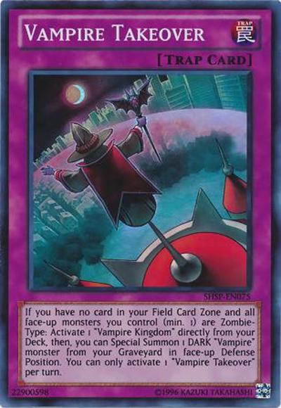 If you have no card in your Field Zone and all face-up monsters you control (min. 1) are Zombie-Type: Activate 1 ‘Vampire Kingdom’ directly from your Deck, then, you can Special Summon 1 DARK ‘Vampire’ monster from your Graveyard in face-up Defense Position. You can only activate 1 ‘Vampire Takeover’ per turn.