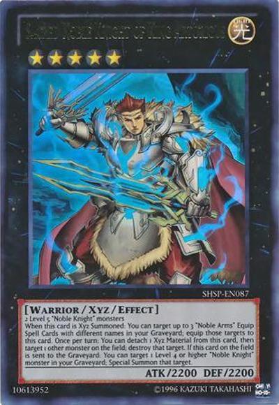 2 Level 5 ‘Noble Knight’ monstersWhen this card is Xyz Summoned: You can target up to 3 ‘Noble Arms’ Equip Spell Cards with different names in your Graveyard; equip those targets to this card. Once per turn: You can detach 1 Xyz Material from this card, then target 1 other monster on the field; destroy that target. If this card is sent from the field to the Graveyard: You can target 1 Level 4 or higher ‘Noble Knight’ monster in your Graveyard; Special Summon that target.