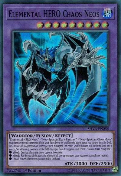 ‘Elemental HERO Neos’ + ‘Neo-Spacian Dark Panther’ + ‘Neo-Spacian Glow Moss’Must first be Special Summoned (from your Extra Deck) by shuffling the above cards you control into the Deck. (You do not use ‘Polymerization’.) Once per turn, during the End Phase: Shuffle this card into the Extra Deck, and if you do, Set all face-up monsters on the field. Once per turn, during your Main Phase 1: You can toss a coin 3 times.● 3 Heads: Destroy all monsters your opponent controls.● 2 Heads: For the rest of this turn, the effects of all face-up monsters your opponent controls are negated.● 1 Head: Return all monsters you control to the hand.