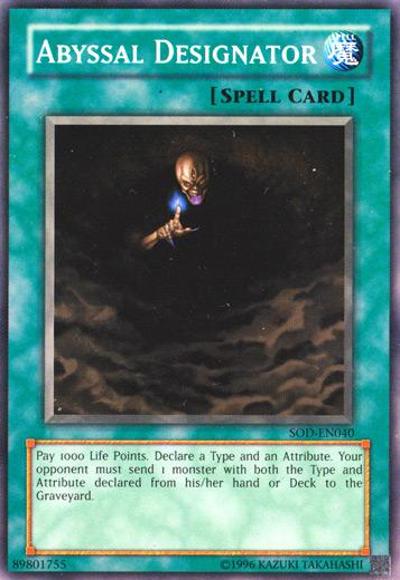 Pay 1000 Life Points. Declare a Type and an Attribute. Your opponent must send 1 monster with both the declared Type and Attribute from their hand or Deck to the Graveyard.