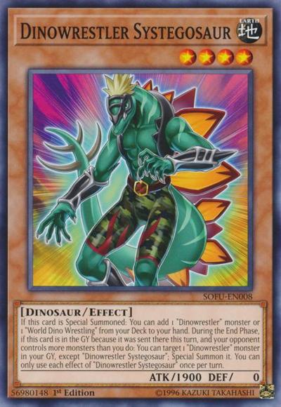 If this card is Special Summoned: You can add 1 ‘Dinowrestler’ monster or 1 ‘World Dino Wrestling’ from your Deck to your hand. During the End Phase, if this card is in the GY because it was sent there this turn, and your opponent controls more monsters than you do: You can target 1 ‘Dinowrestler’ monster in your GY, except ‘Dinowrestler Systegosaur’; Special Summon it. You can only use each effect of ‘Dinowrestler Systegosaur’ once per turn.