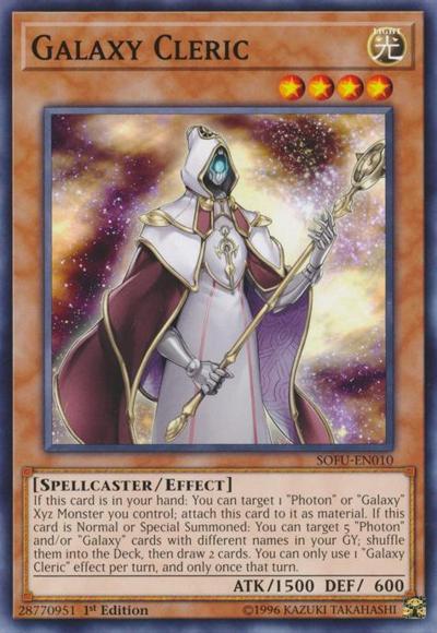 If this card is in your hand: You can target 1 ‘Photon’ or ‘Galaxy’ Xyz Monster you control; attach this card to it as material. If this card is Normal or Special Summoned: You can target 5 ‘Photon’ and/or ‘Galaxy’ cards with different names in your GY; shuffle them into the Deck, then draw 2 cards. You can only use 1 ‘Galaxy Cleric’ effect per turn, and only once that turn.