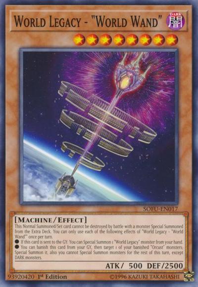 This Normal Summoned/Set card cannot be destroyed by battle with a monster Special Summoned from the Extra Deck. You can only use each of the following effects of ‘World Legacy – ‘World Wand” once per turn.● If this card is sent to the GY: You can Special Summon 1 ‘World Legacy’ monster from your hand.● You can banish this card from your GY, then target 1 of your banished ‘Orcust’ monsters; Special Summon it, also you cannot Special Summon monsters for the rest of this turn, except DARK monsters.