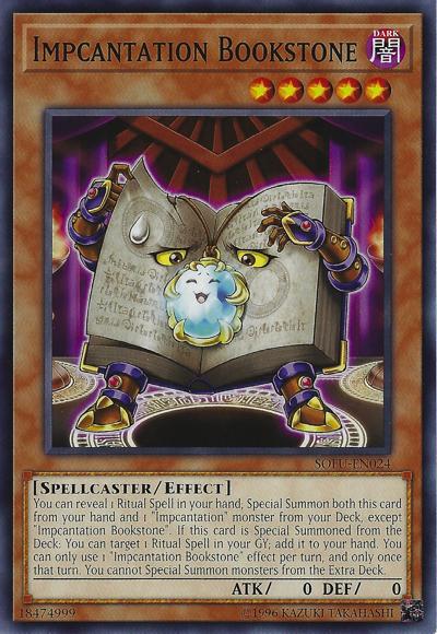 You can reveal 1 Ritual Spell in your hand; Special Summon both this card from your hand and 1 ‘Impcantation’ monster from your Deck, except ‘Impcantation Bookstone’. If this card is Special Summoned from the Deck: You can target 1 Ritual Spell in your GY; add it to your hand. You can only use 1 ‘Impcantation Bookstone’ effect per turn, and only once that turn. You cannot Special Summon monsters from the Extra Deck.