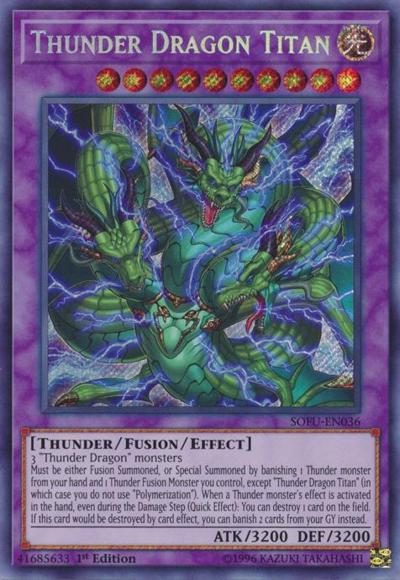 3 ‘Thunder Dragon’ monstersMust be either Fusion Summoned, or Special Summoned by banishing 1 Thunder monster from your hand and 1 Thunder Fusion Monster you control, except ‘Thunder Dragon Titan’ (in which case you do not use ‘Polymerization’). When a Thunder monster’s effect is activated in the hand, even during the Damage Step (Quick Effect): You can destroy 1 card on the field. If this card would be destroyed by card effect, you can banish 2 cards from your GY instead.