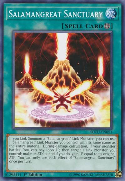 If you Link Summon a ‘Salamangreat’ Link Monster, you can use 1 ‘Salamangreat’ Link Monster you control with its same name as the entire material. During damage calculation, if your monster battles: You can pay 1000 LP, then target 1 Link Monster you control; make its ATK 0, and if you do, gain LP equal to its original ATK. You can only use each effect of ‘Salamangreat Sanctuary’ once per turn.