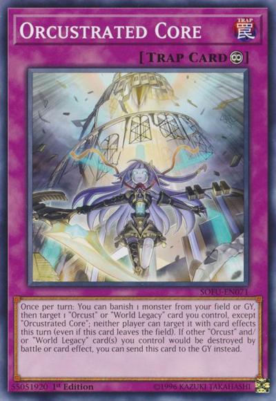 Once per turn: You can banish 1 monster from your field or GY, then target 1 ‘Orcust’ or ‘World Legacy’ card you control, except ‘Orcustrated Core’; neither player can target it with card effects this turn (even if this card leaves the field). If other ‘Orcust’ and/or ‘World Legacy’ card(s) you control would be destroyed by battle or card effect, you can send this card to the GY instead.