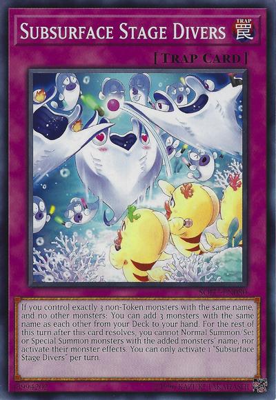 If you control exactly 3 non-Token monsters with the same name, and no other monsters: You can add 3 monsters with the same name as each other from your Deck to your hand. For the rest of this turn after this card resolves, you cannot Normal Summon/Set or Special Summon monsters with the added monsters’ name, nor activate their monster effects. You can only activate 1 ‘Subsurface Stage Divers’ per turn.