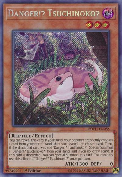 You can reveal this card in your hand; your opponent randomly chooses 1 card from your entire hand, then you discard the chosen card. Then, if the discarded card was not ‘Danger!? Tsuchinoko?’, Special Summon 1 ‘Danger!? Tsuchinoko?’ from your hand, and if you do, draw 1 card. If this card is discarded: You can Special Summon this card. You can only use this effect of ‘Danger!? Tsuchinoko?’ once per turn.