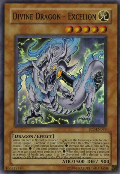 When this card is Normal Summoned, it gets 1 of the following effects for each ‘Divine Dragon – Excelion’ in your Graveyard when this effect resolves (your choice). These effects cannot accumulate. ● This card gains 1000 ATK. ● If this card destroys an opponent’s monster by battle, it can attack once again in a row. ● When this card destroys a monster by battle and sends it to the Graveyard, inflict damage to your opponent equal to the ATK of the destroyed monster.