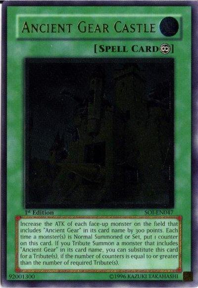 All ‘Ancient Gear’ monsters gain 300 ATK. Each time a monster is Normal Summoned/Set, place 1 counter on this card. If you Tribute Summon an ‘Ancient Gear’ monster face-up, you can Tribute this card instead, if the number of its counters is equal to or greater than the number of required Tribute(s).