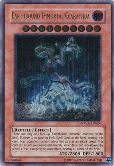 There can only be 1 ‘Earthbound Immortal’ monster on the field. If there is no face-up Field Spell Card on the field, destroy this card. Your opponent cannot target this card for attacks. This card can attack your opponent directly. If this card is destroyed by a card effect, except by its own effect: Destroy all cards on the field.