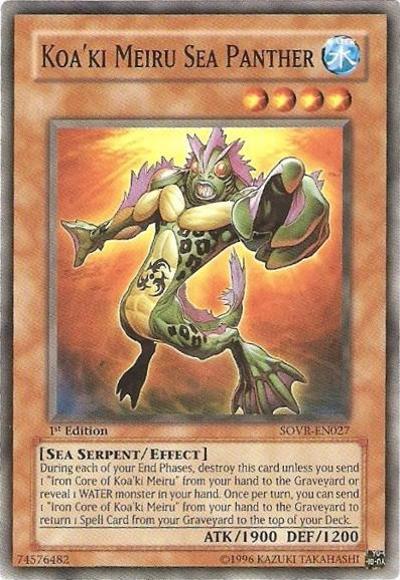 During each of your End Phases, destroy this card unless you send 1 ‘Iron Core of Koa’ki Meiru’ from your hand to the Graveyard or reveal 1 WATER monster in your hand. Once per turn, you can send 1 ‘Iron Core of Koa’ki Meiru’ from your hand to the Graveyard to return 1 Spell Card from your Graveyard to the top of your Deck.