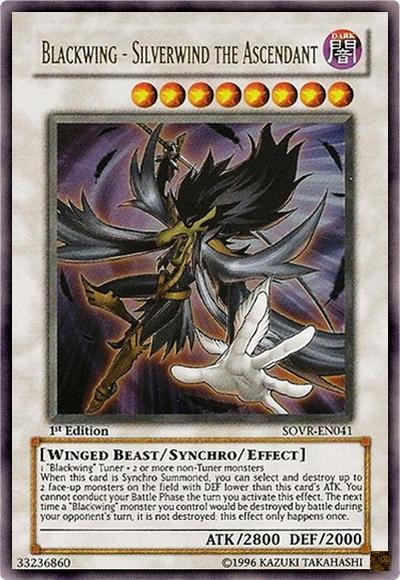 1 ‘Blackwing’ Tuner + 2 or more non-Tuner monstersWhen this card is Synchro Summoned: You can target up to 2 face-up monsters on the field with DEF lower than this card’s ATK; destroy those targets. You cannot conduct your Battle Phase the turn you activate this effect. During each of your opponent’s turns, the first ‘Blackwing’ monster you control that would be destroyed by battle, is not destroyed.