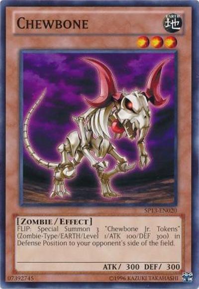 FLIP: Special Summon 3 ‘Chewbone Jr. Tokens’ (Zombie-Type/EARTH/Level 1/ATK 100/DEF 300) to your opponent’s field in Defense Position.