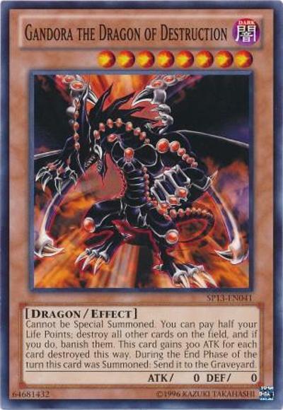Cannot be Special Summoned. You can pay half your LP; destroy as many cards on the field as possible (other than this card), and if you do, banish them. This card gains 300 ATK for each card destroyed this way. Once per turn, during the End Phase, if this card was Normal or Flip Summoned this turn: Send it to the Graveyard.