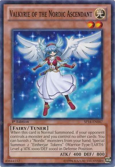 (This card is not treated as a ‘Valkyrie’ card.)When this card is Normal Summoned, if your opponent controls a monster and you control no other cards: You can banish 2 ‘Nordic’ monsters from your hand; Special Summon 2 ‘Einherjar Tokens’ (Warrior/EARTH/Level 4/ATK 1000/DEF 1000) in Defense Position.