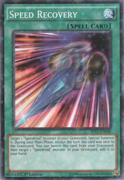 Target 1 ‘Speedroid’ monster in your Graveyard; Special Summon it. During your Main Phase, except the turn this card was sent to the Graveyard: You can banish this card from your Graveyard, then target 1 ‘Speedroid’ monster in your Graveyard; add it to your hand.