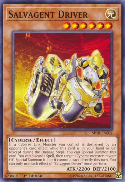 If a Cyberse Link Monster you control is destroyed by an opponent’s card effect while this card is in your hand or GY (except during the Damage Step): You can Special Summon this card. You can discard 1 Spell, then target 1 Cyberse monster in your GY; Special Summon it, but it cannot attack directly this turn. You can only use each effect of ‘Salvagent Driver’ once per turn.