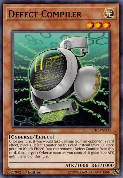 Once per turn, if you would take damage from an opponent’s card effect, place 1 Defect Counter on this card instead (max. 1). Once per turn (Quick Effect): You can remove 1 Defect Counter from this card, then target 1 Cyberse monster you control; it gains 800 ATK until the end of this turn.