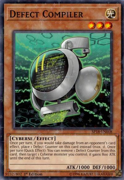 Once per turn, if you would take damage from an opponent’s card effect, place 1 Defect Counter on this card instead (max. 1). Once per turn (Quick Effect): You can remove 1 Defect Counter from this card, then target 1 Cyberse monster you control; it gains 800 ATK until the end of this turn.