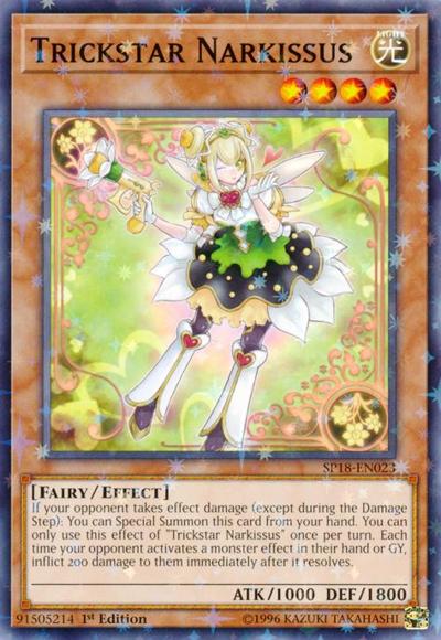 If your opponent takes effect damage (except during the Damage Step): You can Special Summon this card from your hand. You can only use this effect of ‘Trickstar Narkissus’ once per turn. Each time your opponent activates a monster effect in their hand or GY, inflict 200 damage to them immediately after it resolves.