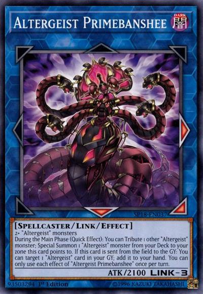 2+ ‘Altergeist’ monstersDuring the Main Phase (Quick Effect): You can Tribute 1 other ‘Altergeist’ monster; Special Summon 1 ‘Altergeist’ monster from your Deck to your zone this card points to. If this card is sent from the field to the GY: You can target 1 ‘Altergeist’ card in your GY; add it to your hand. You can only use each effect of ‘Altergeist Primebanshee’ once per turn.
