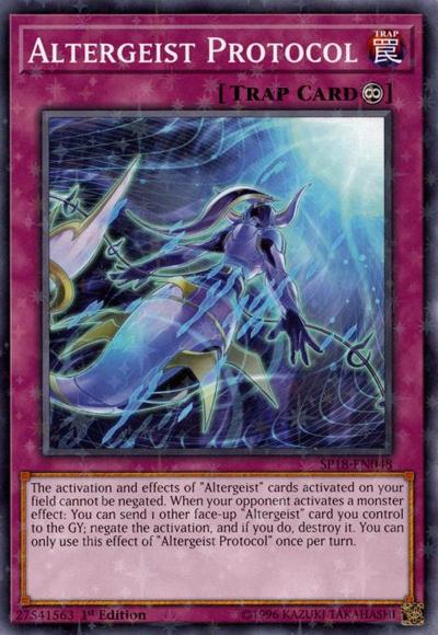 The activation and effects of ‘Altergeist’ cards activated on your field cannot be negated. When your opponent activates a monster effect: You can send 1 other face-up ‘Altergeist’ card you control to the GY; negate the activation, and if you do, destroy it. You can only use this effect of ‘Altergeist Protocol’ once per turn.