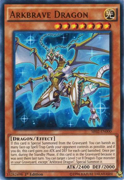 If this card is Special Summoned from the Graveyard: You can banish as many face-up Spell/Trap Cards your opponent controls as possible, and if you do, this card gains 200 ATK and DEF for each card banished. Once per turn, during the Standby Phase, if this card is in the Graveyard because it was sent there last turn: You can target 1 Level 7 or 8 Dragon-Type monster in your Graveyard, except ‘Arkbrave Dragon’; Special Summon it.