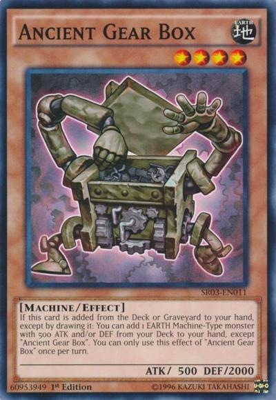 If this card is added from the Deck or Graveyard to your hand, except by drawing it: You can add 1 EARTH Machine-Type monster with 500 ATK and/or DEF from your Deck to your hand, except ‘Ancient Gear Box’. You can only use this effect of ‘Ancient Gear Box’ once per turn.