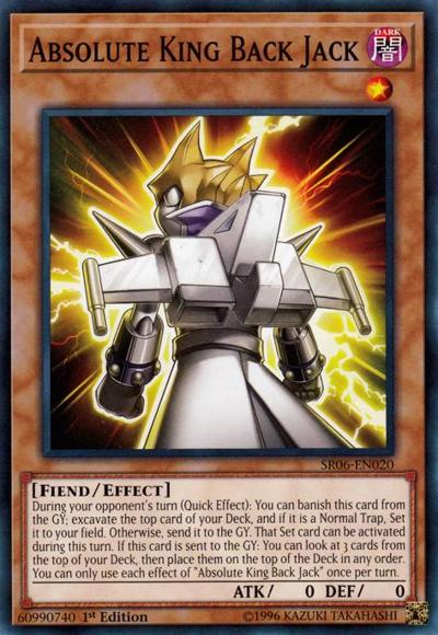 During your opponent’s turn (Quick Effect): You can banish this card from the GY; excavate the top card of your Deck, and if it is a Normal Trap, Set it to your field. Otherwise, send it to the GY. That Set card can be activated during this turn. If this card is sent to the GY: You can look at 3 cards from the top of your Deck, then place them on the top of the Deck in any order. You can only use each effect of ‘Absolute King Back Jack’ once per turn.