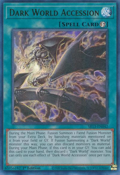 During the Main Phase: Fusion Summon 1 Fiend Fusion Monster from your Extra Deck, by banishing materials mentioned on it from your field or GY. If Fusion Summoning a ‘Dark World’ monster this way, you can also discard monsters as material. During your Main Phase, if this card is in your GY: You can add this card to your hand, then discard 1 ‘Dark World’ monster. You can only use each effect of ‘Dark World Accession’ once per turn.