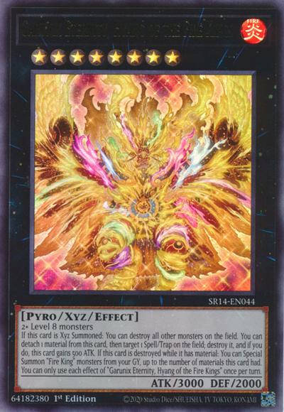 2+ Level 8 monstersIf this card is Xyz Summoned: You can destroy all other monsters on the field. You can detach 1 material from this card, then target 1 Spell/Trap on the field; destroy it, and if you do, this card gains 500 ATK. If this card is destroyed while it has material: You can Special Summon ‘Fire King’ monsters from your GY, up to the number of materials this card had. You can only use each effect of ‘Garunix Eternity, Hyang of the Fire Kings’ once per turn.