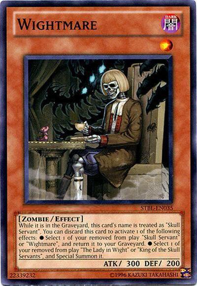 While it is in the Graveyard, this card’s name is treated as ‘Skull Servant’. You can discard this card to activate 1 of the following effects: ● Select 1 of your removed from play ‘Skull Servant’ or ‘Wightmare’, and return it to your Graveyard. ● Select 1 of your removed from play ‘The Lady in Wight’ or ‘King of the Skull Servants’, and Special Summon it.