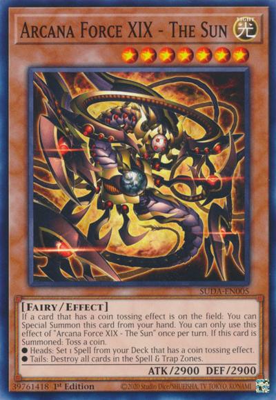 If a card that has a coin tossing effect is on the field: You can Special Summon this card from your hand. You can only use this effect of ‘Arcana Force XIX – The Sun’ once per turn. If this card is Summoned: Toss a coin.● Heads: Set 1 Spell from your Deck that has a coin tossing effect.● Tails: Destroy all cards in the Spell & Trap Zones.