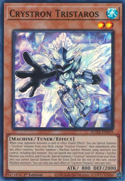 When your opponent activates a card or effect (Quick Effect): You can Special Summon 1 ‘Crystron’ monster from your Deck, except ‘Crystron Tristaros’, then immediately after this effect resolves, Synchro Summon 1 Machine Synchro Monster using monsters you control, including that monster. You can banish this card from your GY; destroy 1 Synchro Monster you control, and if you do, Special Summon 2 ‘Crystron’ monsters from your Deck, also you cannot Special Summon from the Extra Deck for the rest of this turn, except Machine monsters. You can only use each effect of ‘Crystron Tristaros’ once per turn.