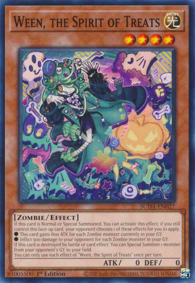 If this card is Normal or Special Summoned: You can activate this effect; if you still control this face-up card, your opponent chooses 1 of these effects for you to apply.● This card gains 800 ATK for each Zombie monster currently in your GY.● Inflict 500 damage to your opponent for each Zombie monster in your GY.If this card is destroyed by battle or card effect: You can Special Summon 1 monster from your opponent’s GY to your field.You can only use each effect of ‘Ween, the Spirit of Treats’ once per turn.