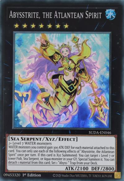 2+ Level 7 WATER monstersWATER monsters you control gain 300 ATK/DEF for each material attached to this card. You can only use each of the following effects of ‘Abysstrite, the Atlantean Spirit’ once per turn. If this card is Xyz Summoned: You can target 1 Level 7 or lower Fish, Sea Serpent, or Aqua monster in your GY; Special Summon it. You can detach 1 material from this card; Set 1 ‘Abyss-‘ Trap from your Deck.