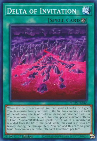 When this card is activated: You can send 1 Level 5 or higher Zombie monster from your Deck to the GY. You can only use each of the following effects of ‘Delta of Invitation’ once per turn. If a Zombie monster is on the field: You can Special Summon 1 ‘Delta Token’ (Zombie/DARK/Level 5/ATK 0/DEF 0). If a monster(s) is added from the GY to the hand, while this card is in your GY (except during the Damage Step): You can add this card to your hand. You can only activate 1 ‘Delta of Invitation’ per turn.