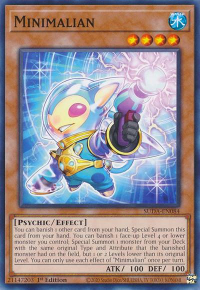 You can banish 1 other card from your hand; Special Summon this card from your hand. You can banish 1 face-up Level 4 or lower monster you control; Special Summon 1 monster from your Deck with the same original Type and Attribute that the banished monster had on the field, but 1 or 2 Levels lower than its original Level. You can only use each effect of ‘Minimalian’ once per turn.
