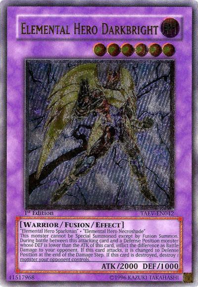 ‘Elemental HERO Sparkman’ + ‘Elemental HERO Necroshade’Must be Fusion Summoned and cannot be Special Summoned by other ways. If this card attacks a Defense Position monster, inflict piercing Battle Damage to your opponent. If this card attacks, change it to Defense Position at the end of the Damage Step. If this card is destroyed: Target 1 monster your opponent controls; destroy that target.